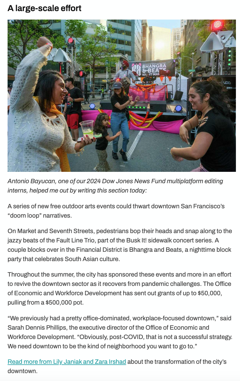 San Francisco Chronicle • July 17 2024 Bay Briefing Newsletter Entry I selected and summarized a story about free arts events in San Francisco for the Bay Briefing newsletter.